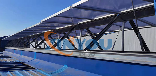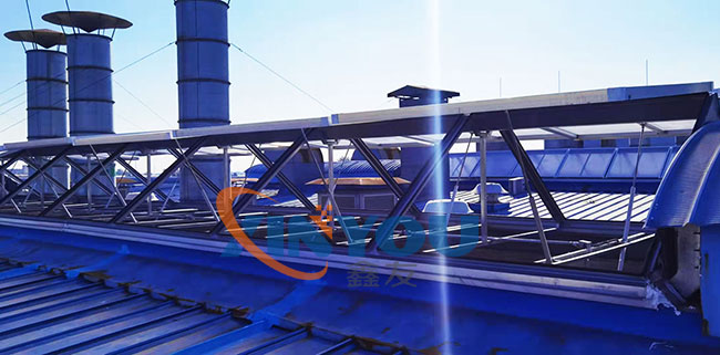 鑫友承接中車唐山8列動車組涂裝廠房電動采光排煙天窗的設備供應及安裝工程,天窗選擇鋁合金電動三角形采光排煙天窗,配置螺桿式開窗機,消防聯(lián)動控制箱。