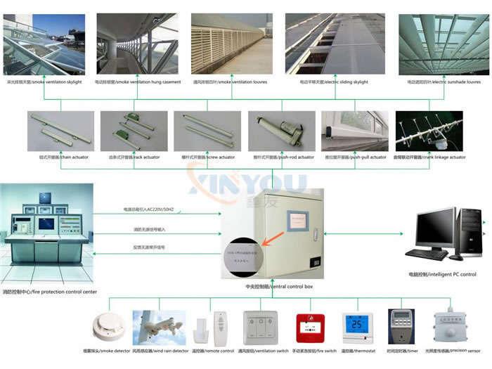 SHEVS is composedof the central control box, fire switch, smoke detector, ventilation switch, remotecontrol, wind rain detector and actuators. SHEVS has the function of Natural VentilationSystems. In addition, when the fire occurs, actuators are triggered through automatic or manual alarmdevice, SHEVS ensure windows are opened for exhausting smoke. Central controlbox is the core of the whole system.