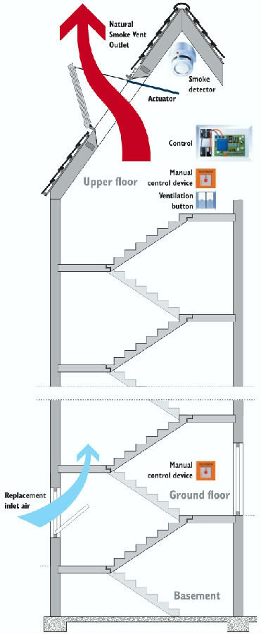 由智能控制箱、消防緊急按鈕、煙霧感應(yīng)器、墻裝開關(guān)、遙控器、風(fēng)雨感應(yīng)器、開窗器等組成,智能消防控制箱與建筑的消防控制室相連,并連接煙霧感應(yīng)器,消防緊急按鈕,發(fā)生火災(zāi)時(shí)無(wú)論手動(dòng)報(bào)警信號(hào)還是自動(dòng)報(bào)警信號(hào)傳送至控制箱,控制箱均立即自動(dòng)命令下級(jí)開窗器進(jìn)行開窗動(dòng)作,從而迅速將室內(nèi)的有毒煙霧排出。