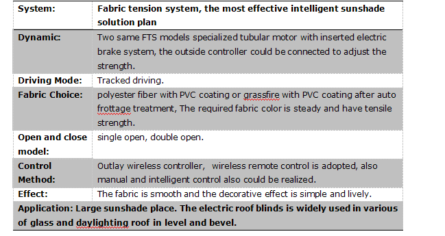FTS天棚簾特別適用于普通電動卷簾無法安裝的彎曲、傾斜的場合,整個系統(tǒng)由驅(qū)動系統(tǒng)、面料和控制系統(tǒng)三部分組成,驅(qū)動系統(tǒng)采用2個FTS專用管狀電機(jī),分別安裝在兩條卷管中,面料一端固定在其中一條卷管上,固定面料另一端的鋼絲繩卷曲在另一條卷管的卷繩器上。這兩臺電機(jī)通過一個專用的控制器協(xié)調(diào)工作,其中一臺電機(jī)提供面料運行的動力,另一臺電機(jī)的剎車同時工作,提供一定的阻力拖住面料,避免面料下墜,天棚完全打開后,面料會卷在其中一條卷管上,運行中或停止時面料均有張力,可制作大面積的平面或弧形面的天棚簾系統(tǒng)。